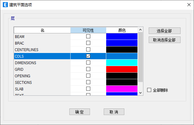 方式二:點(diǎn)擊菜單欄【選項(xiàng)>建筑平面選項(xiàng)】,彈出“建筑平面選項(xiàng)”對(duì)話框,可以設(shè)置各個(gè)建筑層的顏色和可見性。注意此命令在導(dǎo)入建筑平面圖后才可用,運(yùn)行分析后,重新變?yōu)椴豢捎?。如圖4所示為點(diǎn)擊“取消選擇全部”后僅勾選柱子建筑層可見。