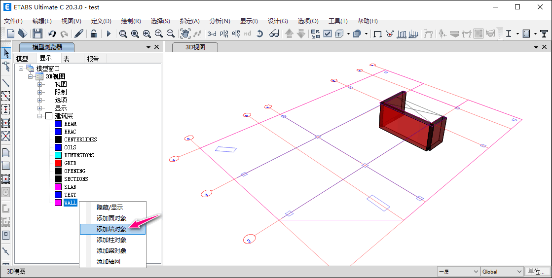 梁和墻的繪制也是類似的操作步驟,只是需要注意繪制梁時(shí)是依次左鍵單擊梁的建筑層(直線);繪制墻時(shí)是依次左鍵單擊墻的建筑層中心線(直線),程序基于墻中心線創(chuàng)建墻對(duì)象。