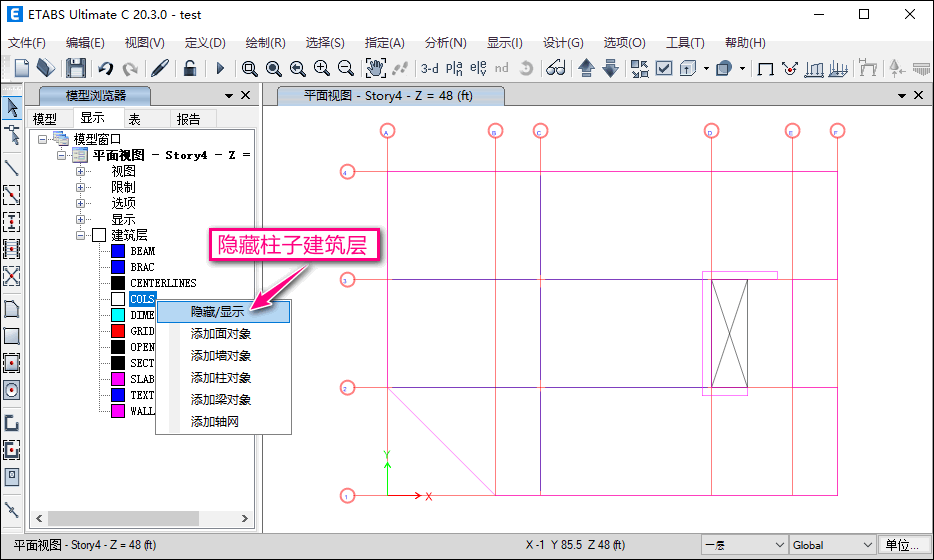 方式一:在【模型瀏覽器>顯示】選項(xiàng)卡中,展開【建筑層】樹狀節(jié)點(diǎn),選中相應(yīng)的建筑層,右鍵單擊彈出相應(yīng)的選項(xiàng)菜單,切換選擇“隱藏/顯示”即可設(shè)置建筑層的可見性,如圖3所示為隱藏柱子建筑層的效果。