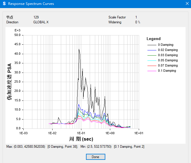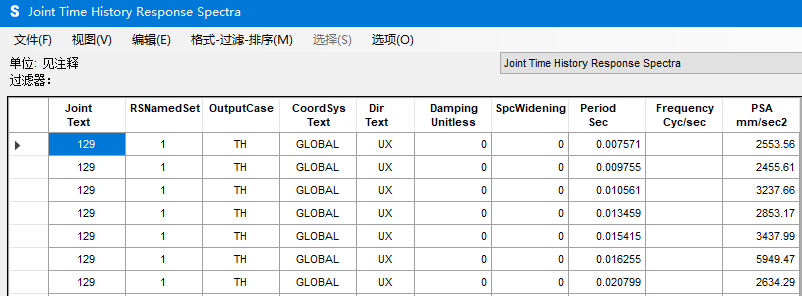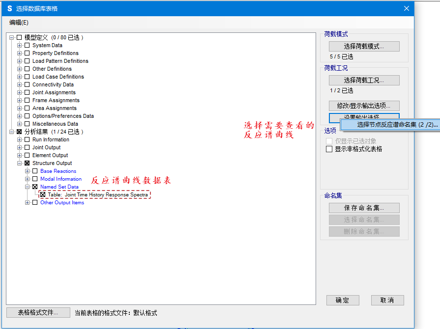 定義了需要的反應(yīng)譜曲線后,通過(guò)【顯示】>【表格】>【Structure Output】>【Named Set Data】可將反應(yīng)譜曲線數(shù)據(jù)點(diǎn)導(dǎo)出,窗口右側(cè)可以選擇需要導(dǎo)出的反應(yīng)譜曲線。