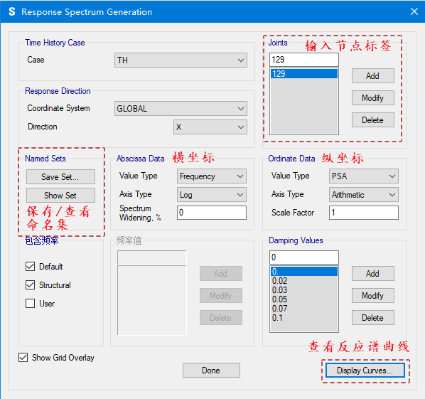 SAP2000中既可以基于支座的固定節(jié)點(diǎn),也可以基于結(jié)構(gòu)中其他位置的任意節(jié)點(diǎn)輸出反應(yīng)譜曲線,具體操作可參考“顯示反應(yīng)譜曲線的具體步驟”。在定義反應(yīng)譜曲線的界面中點(diǎn)擊"Save Set"可以將當(dāng)前的反應(yīng)譜曲線數(shù)據(jù)存儲(chǔ)為一個(gè)命名集,也可以通過(guò)"Show Set"隨時(shí)查看生成的反應(yīng)譜曲線。