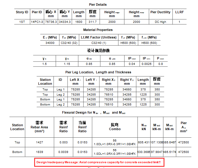 某混凝土框架-剪力墻結(jié)構(gòu),墻體按高延性等級(jí)設(shè)計(jì),設(shè)計(jì)細(xì)節(jié)中出現(xiàn)“超出混凝土軸壓承載力限值"的警告信息(如下圖),但是細(xì)節(jié)中軸力Ned為拉力,且內(nèi)力和配筋結(jié)果很正常,配筋率都在正常范圍內(nèi),請(qǐng)問(wèn)是什么原因?
