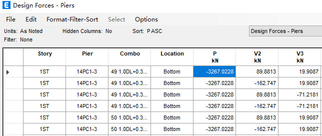 forces>Design forces-Piers】表格中查看墻體承受的最大軸壓力(拉為正壓為負(fù))。如下圖所示,該片墻體的最大軸壓力為3267.0228kN。