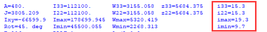 在設(shè)計(jì)細(xì)節(jié)中可以看見,程序輸出了4個(gè)回轉(zhuǎn)半徑,分別為對(duì)局部2軸的回轉(zhuǎn)半徑i22、對(duì)局部3軸的回轉(zhuǎn)半徑i33、對(duì)強(qiáng)軸的回轉(zhuǎn)半徑i max和對(duì)弱軸的回轉(zhuǎn)半徑i min。