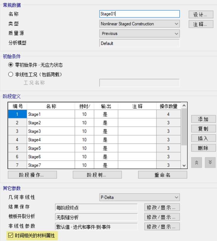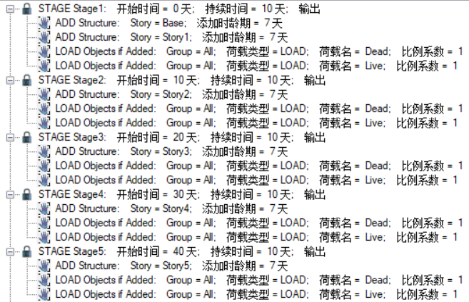 通過【定義>材料>時(shí)間相關(guān)屬性】設(shè)置材料與時(shí)間相關(guān)的收縮徐變系數(shù),然后定義階段施工工況,工況中設(shè)置 10 個(gè)操作步,每步添加一層結(jié)構(gòu)和相應(yīng)的荷載,模擬逐層施工的過程,同時(shí)勾選考慮“時(shí)間相關(guān)的材料屬性”。工況定義對話框與階段樹見圖 1 和圖 2。
