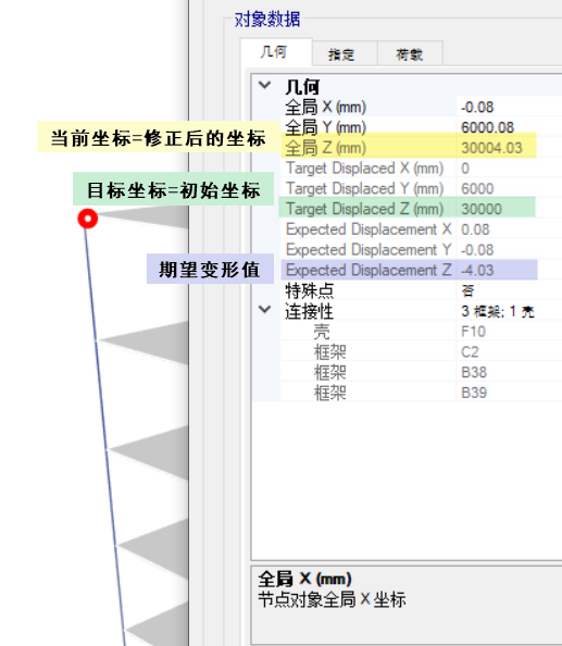 點(diǎn)擊“確定”后,程序?qū)⒆詣?dòng)解鎖,可以看見節(jié)點(diǎn)坐標(biāo)發(fā)生變化,變化量與變形值一致,如圖 4 所示。