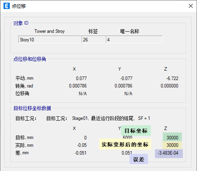 此時(shí)再進(jìn)行階段施工分析,通過變形圖校驗(yàn)當(dāng)前結(jié)果是否滿足預(yù)期,若不滿足,可再次進(jìn)行“修改未變形幾何”,直至達(dá)到預(yù)期。對于高層建筑,往往需要多次迭代計(jì)算。本例通過兩次迭代計(jì)算達(dá)到預(yù)期效果,右鍵單擊節(jié)點(diǎn),可查看位移結(jié)果,頂點(diǎn)位移結(jié)果如圖 5 所示。