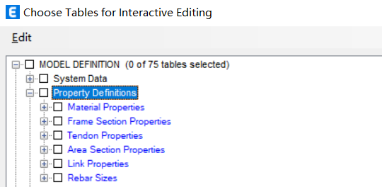 Definitions】,依次檢查材料、框架截面等屬性定義表格,查看是否存在屬性缺失的情況。