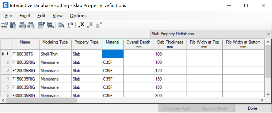 本例中,“F100C30T6”樓板截面的材料屬性缺失(圖3中藍色區(qū)域),導致創(chuàng)建分析模型時在該截面屬性處出錯,無法完成后續(xù)分析。在此處補充定義材料屬性后(需要注意,此處應填寫已定義的材料名稱),依次點擊窗口右下方的【Apply to Model>Done】,完成屬性的調(diào)整,模型可順利運行分析。