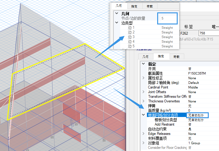 檢查發(fā)現(xiàn),模型中存在大量多邊形斜板(大于4邊),如下圖所示,該板由五個(gè)節(jié)點(diǎn)組成。對(duì)于斜板,程序默認(rèn)采用“NO Auto Meshing(不自動(dòng)剖分)”的剖分選項(xiàng),而對(duì)于邊數(shù)大于4的面對(duì)象,該剖分選項(xiàng)下ETABS生成的分析模型不會(huì)考慮此類樓板,當(dāng)然也不進(jìn)行力的傳遞與受力分析,該樓板只出現(xiàn)在對(duì)象模型階段,從而導(dǎo)致樓層總質(zhì)量小于Group All的質(zhì)量。關(guān)于該剖分選項(xiàng)更詳細(xì)的內(nèi)容可參考“樓板不剖分選項(xiàng)在ETABS、SAP2000中的區(qū)別”。