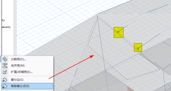 對(duì)于上圖所示多點(diǎn)共線的面對(duì)象,無(wú)需重新繪制,可直接選中面邊多余的節(jié)點(diǎn)以及面對(duì)象,通過(guò)【編輯>編輯殼>移除等分點(diǎn)】將節(jié)點(diǎn)移除,如下圖,移除后為四邊形面對(duì)象。
