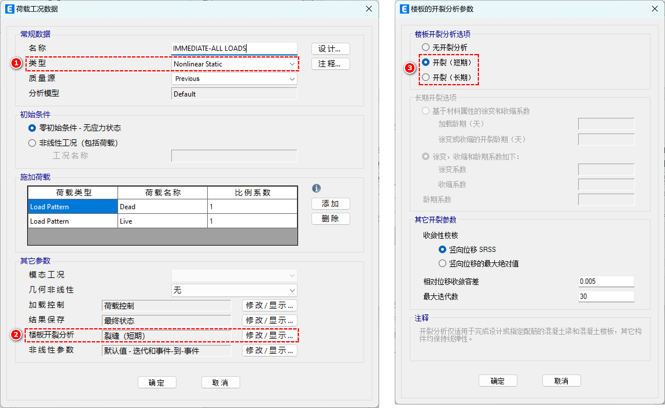 步驟 1:點(diǎn)擊【定義>荷載工況】,添加非線性靜力荷載工況,修改【樓板開裂分析】參數(shù),如圖 1 所示。