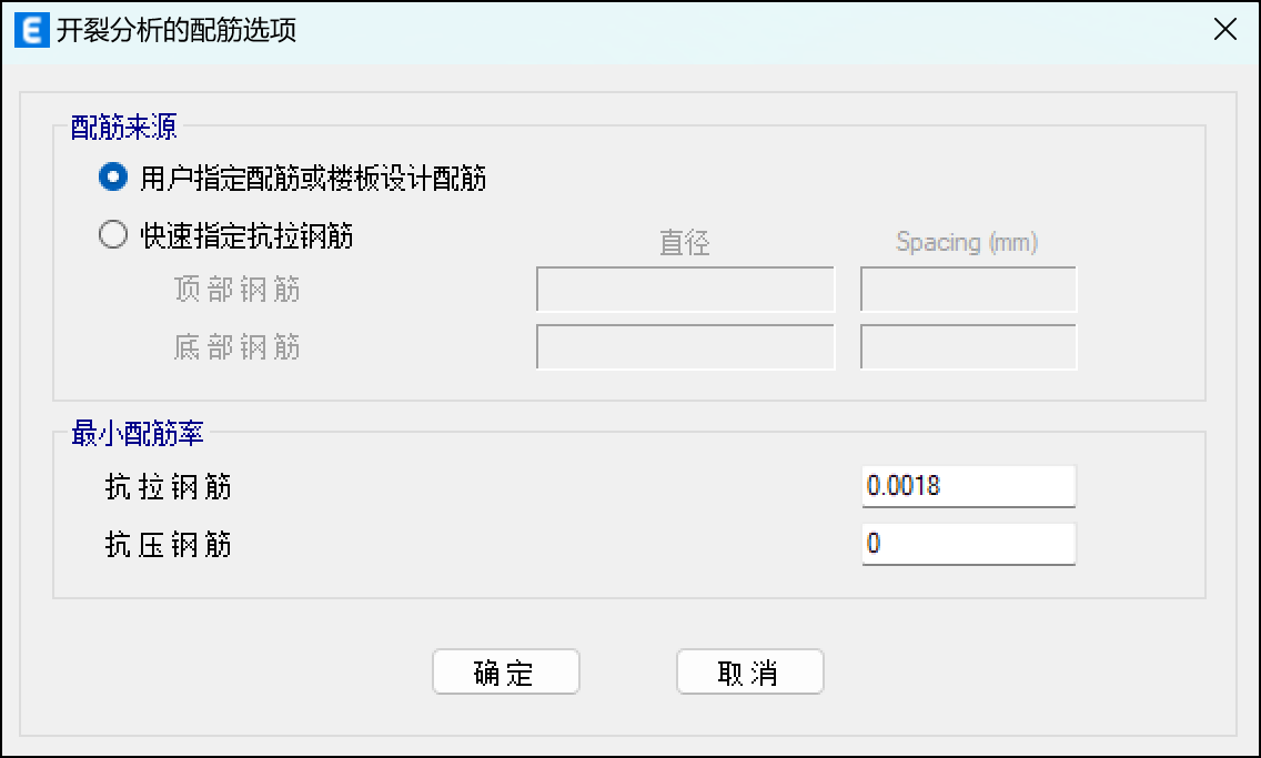 步驟 3:點(diǎn)擊【分析>開裂分析選項(xiàng)】,設(shè)置開裂分析的配筋來源,如圖 4 所示。關(guān)于此對話框的詳細(xì)介紹,請參考知識庫《開裂分析和裂縫計算的配筋來源》。