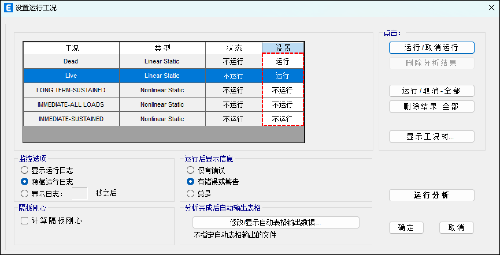 步驟 5:點(diǎn)擊【分析>設(shè)置運(yùn)行工況】,設(shè)置不運(yùn)行開裂分析的非線性工況,僅運(yùn)行用于下一步混凝土樓板和框架設(shè)計的荷載工況,如圖 6 所示。