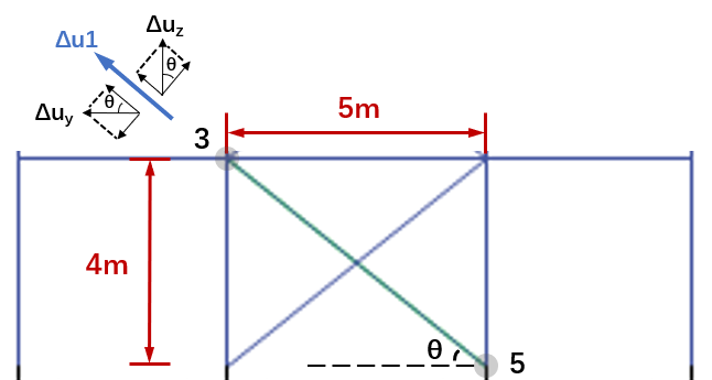 兩點(diǎn)位移計(jì)的局部1軸沿著桿件軸向,所以構(gòu)件軸向變形ΔU1可由桿件兩端節(jié)點(diǎn)的位移差ΔUy和ΔUz分解得到,即: