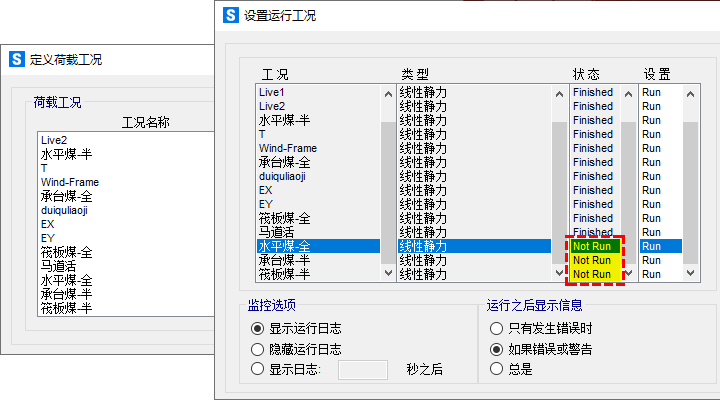 此外,非法字符不僅可能引起設(shè)計(jì)結(jié)果顯示異常,還可能導(dǎo)致無法運(yùn)行某些荷載工況。如圖6所示,荷載工況名稱中包含中文字符,導(dǎo)致程序無法運(yùn)行部分荷載工況。