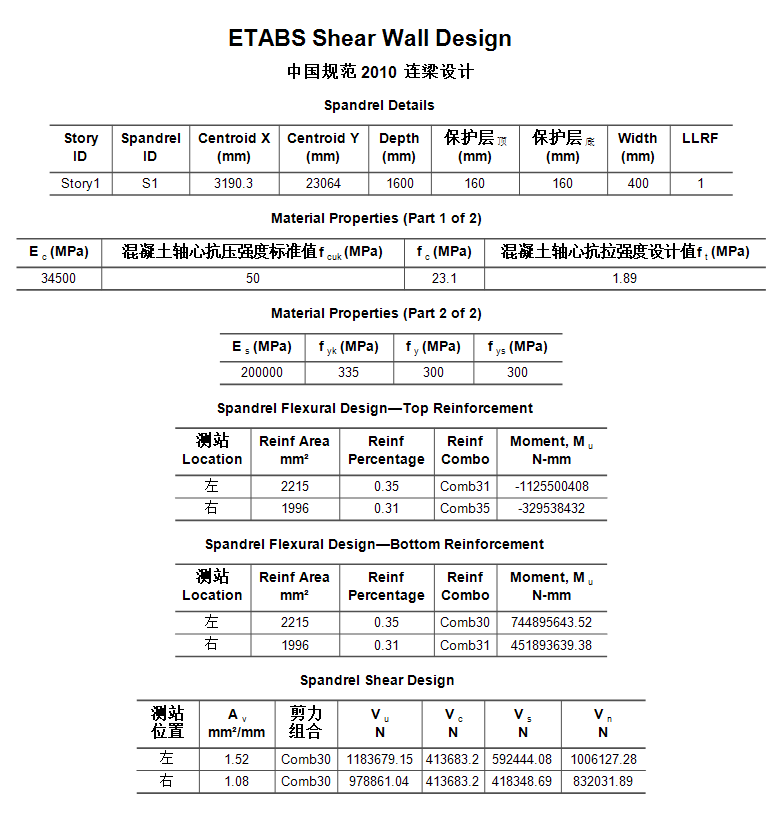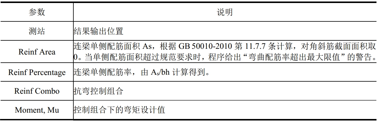 50010-2010第11.7.7條完成連梁的正截面配筋計(jì)算。采用對(duì)稱配筋,設(shè)計(jì)時(shí)頂部、底部分別計(jì)算,取配筋較大值作為最終結(jié)果,輸出在細(xì)節(jié)表格中。