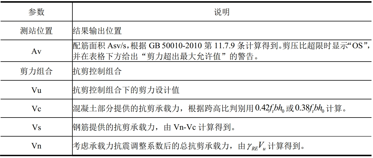 50010-2010第11.7.9條完成連梁的斜截面配筋計(jì)算,各項(xiàng)參數(shù)說明詳見下表。