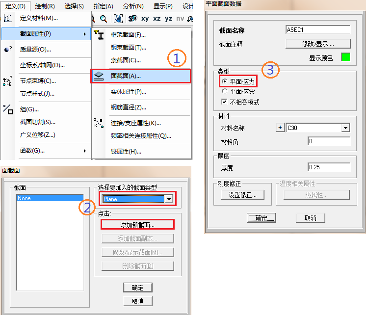 在滿足上述三條假定的基礎(chǔ)上,用戶可定義平面應(yīng)變單元。具體方法和操作步驟如下所示: