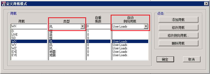 1.通過命令定義>荷載模式,打開定義荷載模式對話框。在該對話框的荷載編輯框輸入一個名稱,在類型編輯框中選擇風,會激活自動側(cè)向荷載下拉列表。在該下拉列表中選擇User Loads,點擊添加荷載按鈕就會增加一個自定義風荷載的荷載模式。