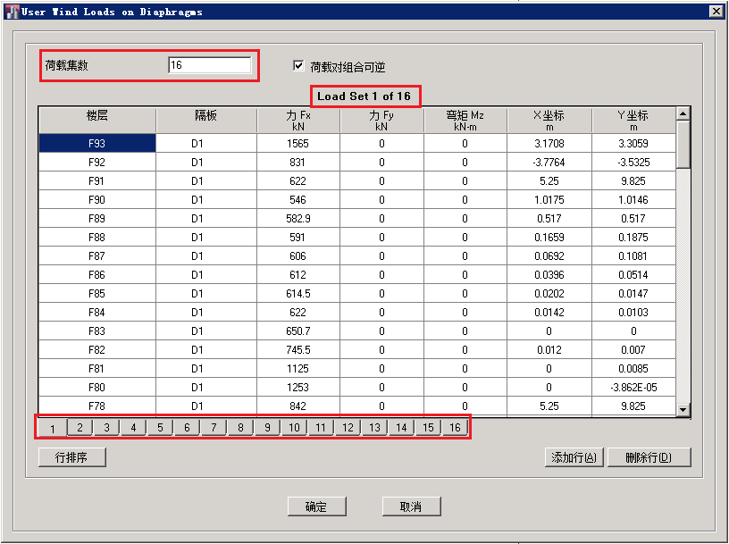 2.高亮顯示該荷載模式,點擊修改側(cè)向荷載命令,彈出如下圖所示的對話框。在荷載集數(shù)編輯框中輸入風向角數(shù)量。通過切換不同的風向角(對話框下端的編號),并在中間區(qū)域的編輯框中輸入相應(yīng)的數(shù)值(計算得到的風荷載大小、作用點位置等信息),就可以通過隔板將風荷載施加到結(jié)構(gòu)上。注意:通過這種方式只需一個荷載模式就可以將不同方向角的風荷載施加到結(jié)構(gòu)上。