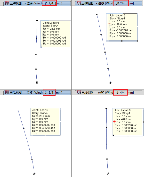 下圖以四個風向角的情況(分別對應(yīng)正負X軸、正負Y軸的風荷載)為例,說明該工況各方向的結(jié)果并不疊加。
