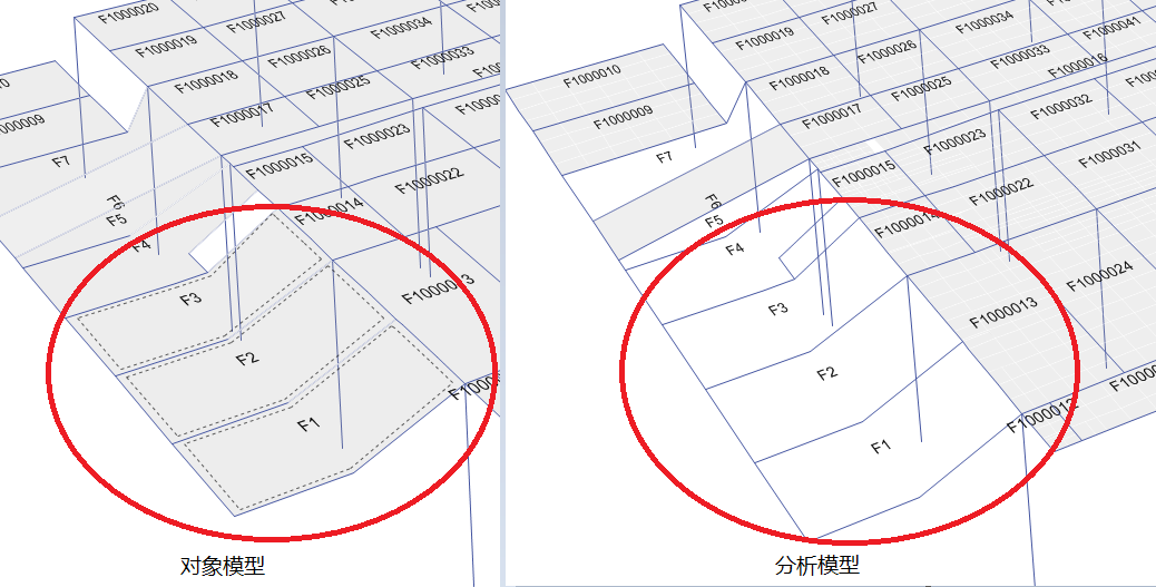 根據(jù)警告內(nèi)容找出警告發(fā)生的位置后,發(fā)現(xiàn):第一層的樓板不在同一個(gè)水平面上,存在一些斜向的樓板。建模時(shí),工程師將斜向樓板和水平樓板作為同一個(gè)對(duì)象進(jìn)行建模,而這一類(lèi)對(duì)象無(wú)法生成分析模型(見(jiàn)下圖),所以其上的荷載也會(huì)隨之丟失。