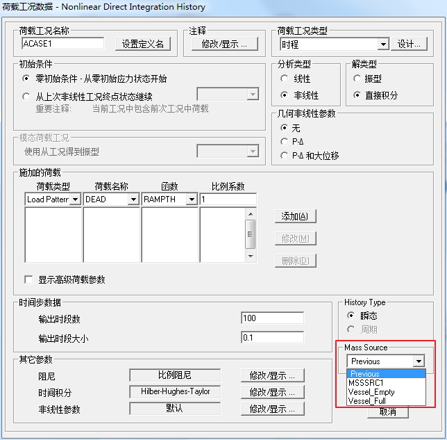模態(tài)疊加法時(shí)程法與反應(yīng)譜方法一樣,其分析都是基于模態(tài)分析的結(jié)果進(jìn)行的,如在分析中要使用不同的質(zhì)量源,可采用與第4條相同的方法。