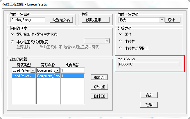 當(dāng)采用底部剪力法求解設(shè)備不同負(fù)荷下的地震作用時(shí),也需要使用不同的質(zhì)量源。例如,工業(yè)容器具在空載時(shí),需要使用空載時(shí)的質(zhì)量源求解地震響應(yīng);而容器具在滿載時(shí),需要使用滿載的質(zhì)量源求解地震響應(yīng)。在定義荷載工況對(duì)話框中,可查看到工況求解使用的質(zhì)量源如下圖所示,為MSSSRC1,此值為質(zhì)量源定義中的默認(rèn)質(zhì)量源,且在此對(duì)話框中質(zhì)量源選項(xiàng)是不能更改的。