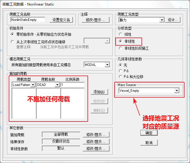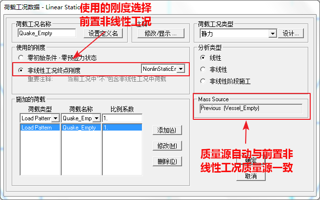 為方便控制底部剪力法工況中所使用的質(zhì)量源,除了修改默認(rèn)質(zhì)量源的辦法外,還可在求解地震工況前設(shè)置一個(gè)空靜力非線性工況,在此非線性工況中將質(zhì)量源修改為地震求解中需要對(duì)應(yīng)的質(zhì)量源,而在施加的荷載欄中不添加任何的荷載。再修改底部剪力法工況定義,將“使用的剛度”修改為“前置非線性工況的終點(diǎn)剛度”,此時(shí),底部剪力法所使用的質(zhì)量源自動(dòng)變?yōu)榍爸梅蔷€性工況的質(zhì)量源。
