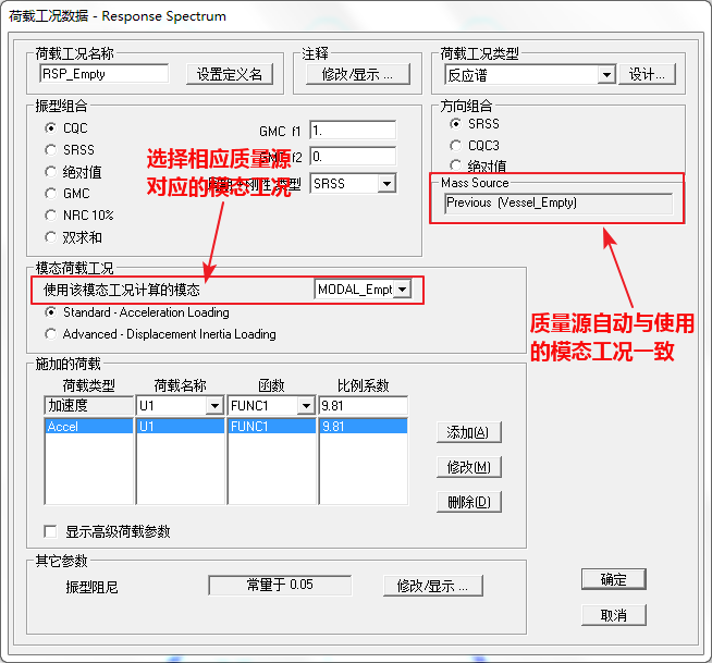 在反應(yīng)譜工況定義對(duì)話框中,在“模態(tài)荷載工況”欄中,選擇相應(yīng)質(zhì)量源對(duì)應(yīng)的模態(tài)工況。同時(shí),質(zhì)量源會(huì)自動(dòng)調(diào)整為與所使用的模態(tài)工況相一致。