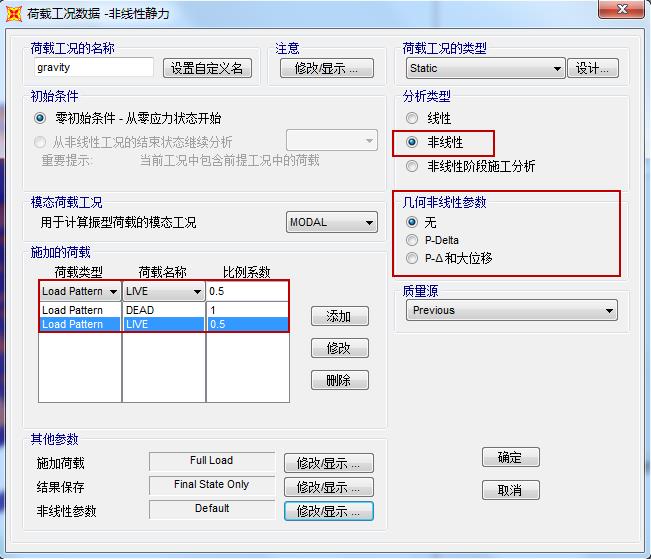 分析類型選擇“非線性”,添加荷載類型:1.0恒載和0.5活載(重力荷載代表值),可根據(jù)具體情況選擇是否考慮幾何非線性參數(shù),具體設置如圖1所示。