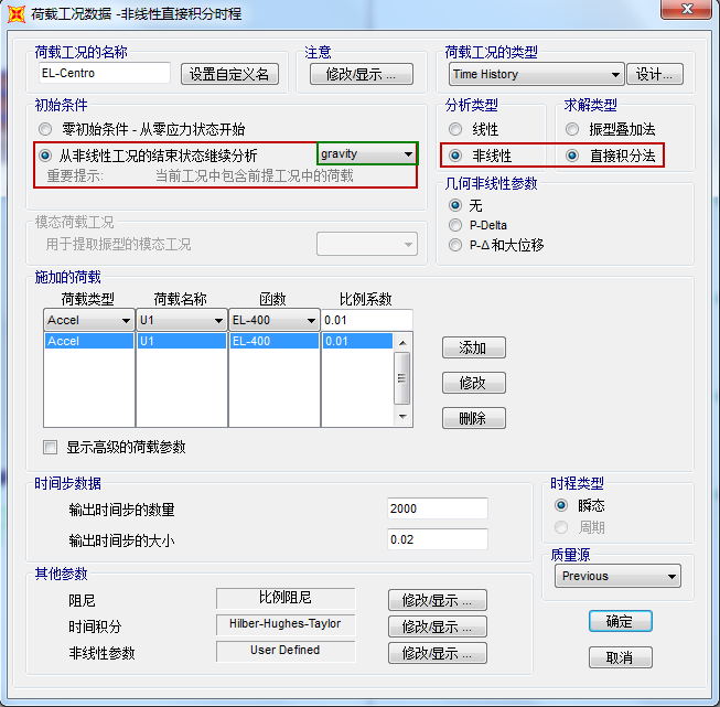 非線性靜力工況、非線性施工順序工況和非線性直接積分時程工況都可以作為直接積分法非線性工況的初始條件。對于模擬地震作用時結(jié)構(gòu)已承受的重力荷載,初始條件通常選擇非線性靜力工況。具體操作如下: