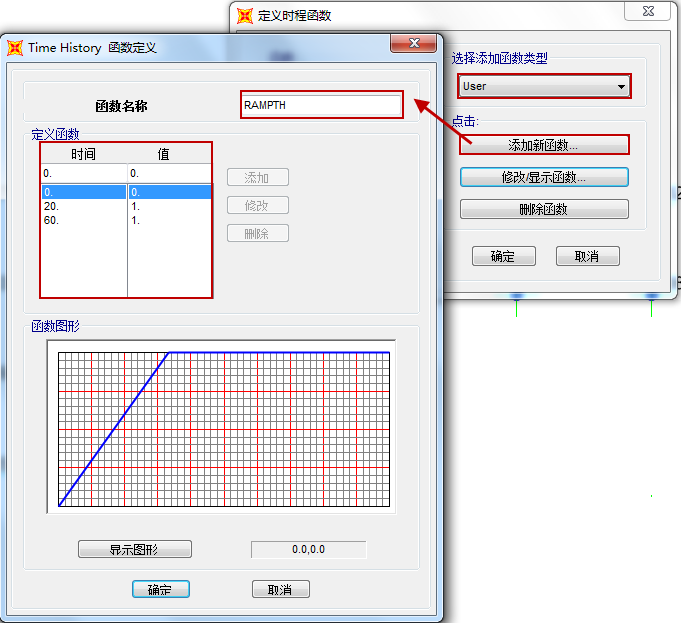 步驟一:定義斜坡函數(shù),以緩慢地施加重力荷載,命令為:定義>函數(shù)>時程,具體參數(shù)見圖3。