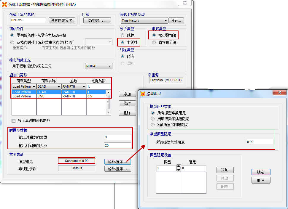 為了抑制結(jié)構(gòu)的振動,使用高模態(tài)阻尼,取0.99。添加荷載類型:1.0恒載和0.5活載;函數(shù)選擇RAMPTH斜坡函數(shù);具體的參數(shù)設置如圖4所示。