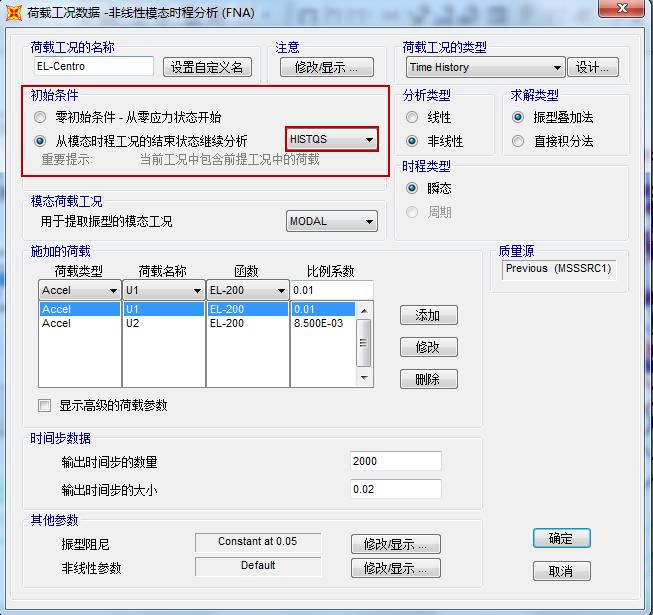 步驟三:在定義地震時程工況時,選擇從HISTQS工況的結(jié)束狀態(tài)繼續(xù)分析,如圖5所示。