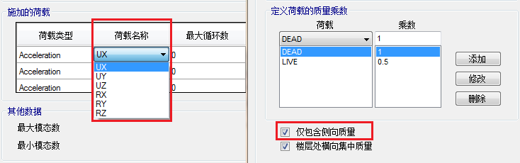 3. 在定義里茲向量分析時:對于反應(yīng)譜分析,只需要加速度荷載;對于線性模態(tài)時程分析,需要添加可能存在的荷載模式或加速度荷載;對于非線性模態(tài)時程分析,還應(yīng)該包括連接單元的非線性變形。