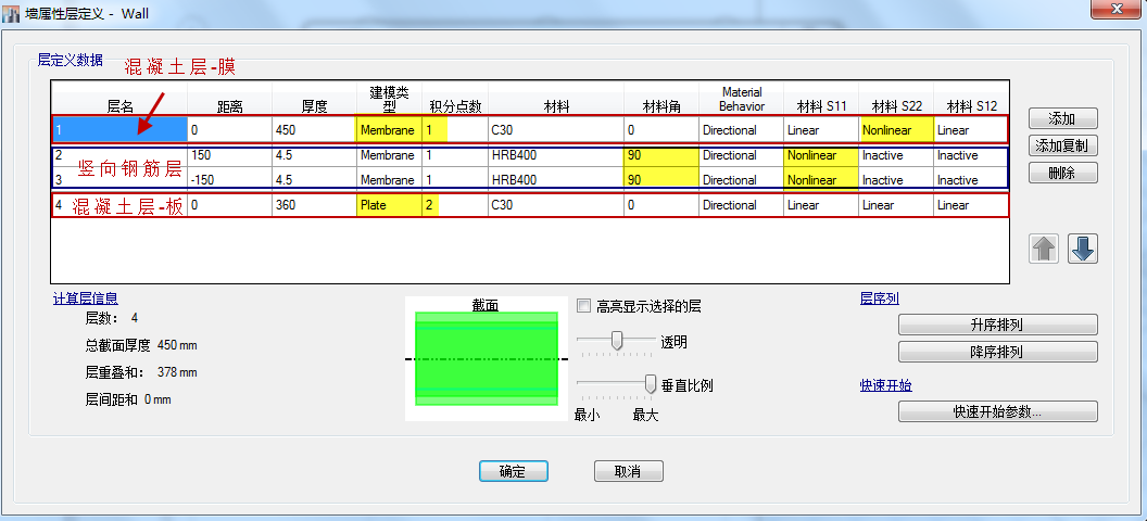 層名1為混凝土層,單元類型采用殼(shell),三個(gè)材料分量均考慮為非線性(nonlinear),積分點(diǎn)數(shù)設(shè)為最大值5以盡可能準(zhǔn)確地捕捉其屈服后行為。