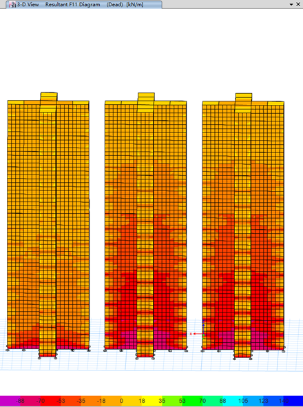 解決辦法:通常情況下,屈曲因子可以使用準剛性隔板模型計算,這樣能更加真實的反映結構的情況。如果因為某些計算要求而必須要使用剛性隔板時,可以將墻體材料的泊松比設為0,這樣將不會出現墻體橫向壓力,也可以避免扭轉屈曲的過早出現。
